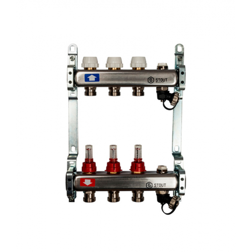 Коллекторная группа Stout (SMS-0927-000003) 1 ВР(г) х 3 выхода 3/4 НР(ш) ЕК х 1 ВР(г) с расходомерами нержавеющая сталь