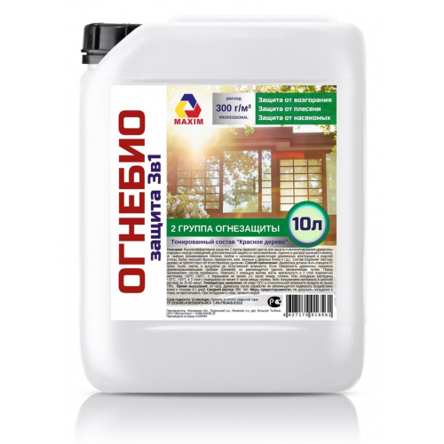 Комплексная огнебиозащитная пропитка для древесины, используемой внутри помещений и на открытом воздухе без прямого воздействия атмосферных осадков и контакта с грунтом. Предназначена для обработки древесины от возникновения и распространения огня, а также от воздействия биологических агентов (дереворазрушающие грибки, насекомые и их личинки).
