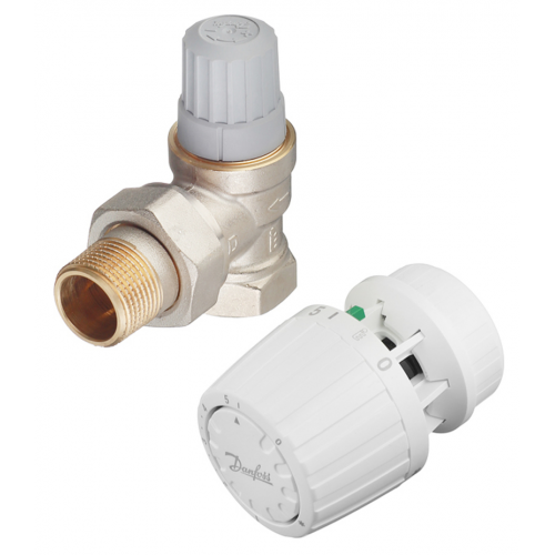 Клапан (вентиль) термостатический угловой Danfoss (013G2233) 3/4 НР(ш) х 3/4 ВР(г) для однотрубных систем с термоголовкой комплект