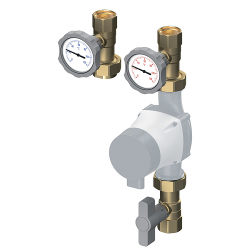 Комплект UK без смешения для подключения циркуляционных насосов в котельных. Оптимальное решение для коллекторов с выходами НР1". – Изолируемый шаровой кран (тип C) – 1 шт., – Изолируемый шаровой кран (тип C) с термометром в ручке, две прижимные гайки и уплотнителя – 1 шт., – Изолируемый шаровой кран (тип R) со встроенным обратным клапаном и термометром в ручке; резьбовое соединение – 1 шт.