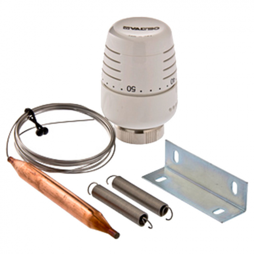 Термостатическая головка, соединенная медной капиллярной трубкой длиной 2 м с выносным накладным датчиком температуры. Диапазон регулирования – от 20 до 60 °C. Головка применяется для управления термостатическим клапаном в составе насосно-смесительных узлов напольного отопления (теплый пол). Датчик монтируется на трубопроводе с помощью ложемента и хомутов.