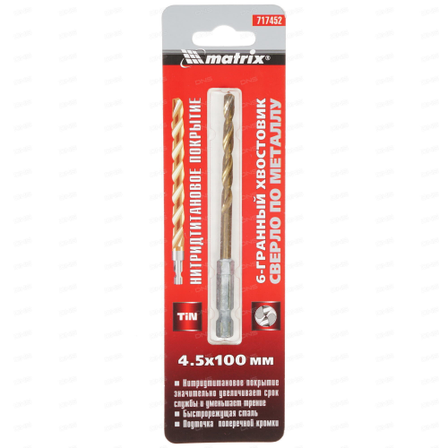 Сверло по металлу, 4.5 мм, HSS, нитридтитановое покрытие, шестигранный хвостовик Matrix Артикул: 717452