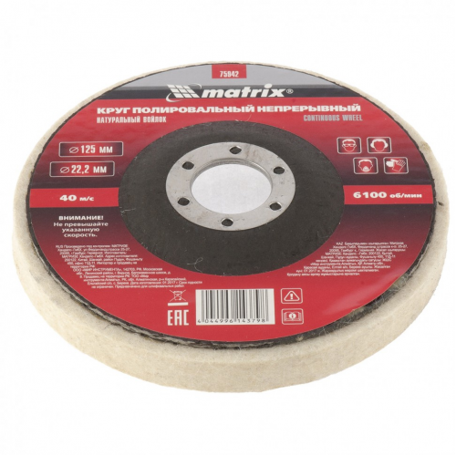 Непрерывный полировальный круг из натурального войлока Matrix 75942, 125 х 22,2 мм — оснастка для углошлифовальных машин, предназначенная для финишной отделки металлических, стальных, стеклянных, пластмассовых и других материалов. Круг эффективен при работе на плоских поверхностях и будет полезен на стройплощадке, в автосервисе, а также в домашней мастерской.