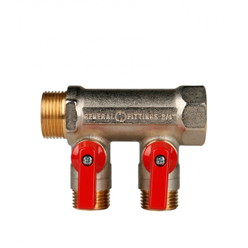 Имеет с одного входа внутреннюю резьбу 3/4" (20 мм) с другого входа наружную резьбу 3/4" (20 мм), что позволяет соединять коллекторы между собой, увеличивая количество отводимых линий. Ручки красного цвета.