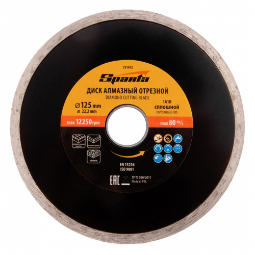 Отрезной алмазный диск Sparta 731415, сплошной, 125 х 22,2 мм - расходный инструмент для болгарок и плиткорезов, используемый для мокрого резания. Он позволяет выполнить аккуратный рез по керамике, керамограниту и мрамору в бытовых условиях. Рекомендуется применять с использованием водяного охлаждения.