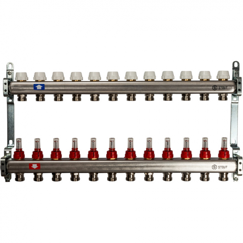 Коллекторная группа Stout (SMS 0917 000012) 1 ВР(г) х 12 выходов 3/4 НР(ш) ЕК х 1 ВР(г) с расходомерами нержавеющая сталь