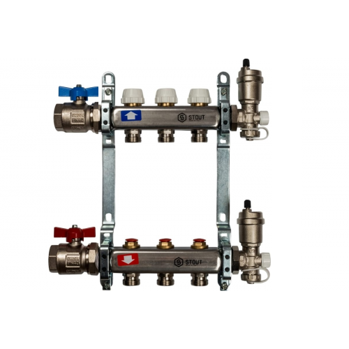 Коллектор из нержавеющей стали в сборе без расходомеров STOUT 3 выхода SMS 0912 000003 - это приспособление, которое можно использовать как в домах индивидуальной застройки, так и в системах отопления многоквартирных жилых зданий. Изделие способно распределять теплоноситель на три узла, а также контролировать температуру теплоносителя на входе и выходе из коллектора.