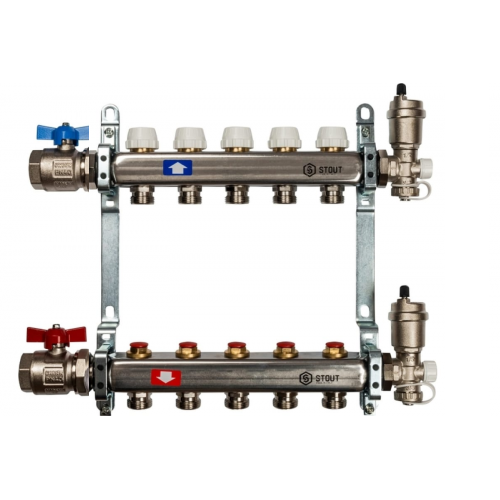 Коллектор из нержавеющей стали в сборе без расходомеров STOUT 5 выходов SMS 0912 000005 - это прочное приспособление можно использовать в домах индивидуальной застройки или в системах отопления многоквартирных жилых зданий. Наличие шаровых кранов и клапанов позволяет перекрывать подачу теплоносителя во всю систему или в отдельные узлы.