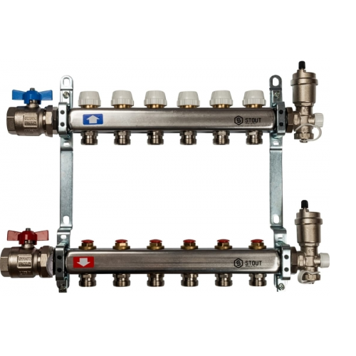 Коллектор из нержавеющей стали в сборе без расходомеров STOUT 6 выходов SMS 0912 000006 предназначен для подачи и распределения воды в системах теплого пола или в радиаторах отопления. Изделие позволяет перекрывать систему полностью с помощью шаровых кранов или отдельные узлы благодаря запорно-балансировочным клапанам (6 штук).