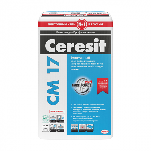 Клей для плитки и керамогранита Ceresit СМ 17 FibreForce эластичный серый (класс С2TE S1) 25 кг