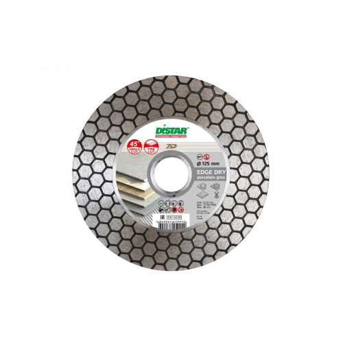 Именно такими свойствами и обладает алмазный круг Edge Dry. Широкий двухсторонний алмазоносный слой 25 мм армирует корпус, делает его жестким. В то же время алмазоносная связка с «сотовым» рисунком слоя делает резание мягким и высокопроизводительным. Большая плоскость создает эффект «опоры», направляя круг строго по прямой. Дополнительно можно подшлифовать кромку торца плитки.