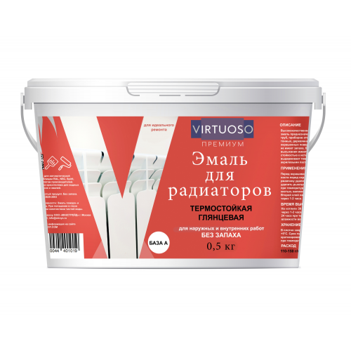 Акриловая эмаль VIRTUOSO PREMIUM предназначена для защитно-декоративного и экологичного окрашивания радиаторов, конвекторов, а также труб систем отопления и водоснабжения, по новым и ранее окрашенным поверхностям. Выдерживает нагревание до +100°С, при этом не желтеет, сохраняет стойкий белый цвет.