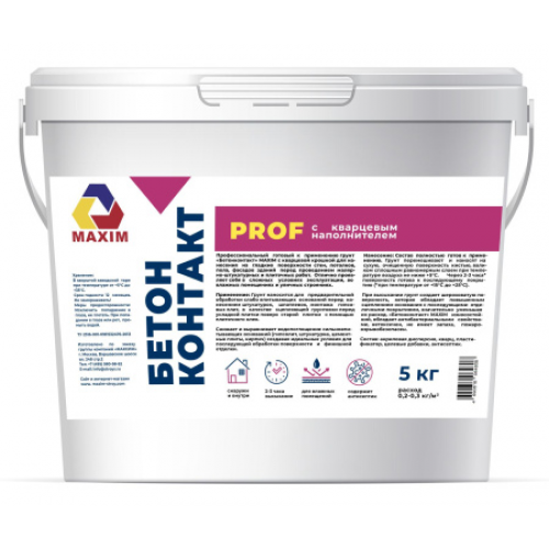 Профессиональный готовый к применению грунт «Бетонконтакт» MAXIM с кварцевой крошкой для нанесения на гладкие поверхности стен, потолков, пола, фасадов зданий перед проведением малярно-штукатурных и плиточных работ. Отлично проявляет себя в сложных условиях эксплуатации, во влажных помещениях и уличных строениях.
