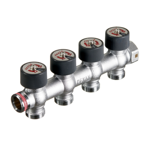 Коллекторы оснащены встроенными регулирующими вентилями с возможностью плавной регулировки расхода и полного перекрытия. Отводы имеют наружную резьбу G 3/4 евроконус.