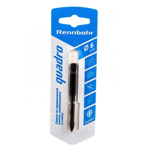 Сверло по керамике Quadro 6 мм RENNBOHR 676106 применяется для сверления отверстий в керамической плитке 1-4 класса твёрдости, керамограните, стекле.