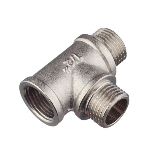 Латунный никелированный трехсторонний фитинг, равнопроходной. Резьба – внутренняя/наружная/наружная, цилиндрическая трубная по ГОСТу 6357 (ISO 228, EN 10226). Внутренняя резьба совместима также с наружной конической трубной резьбой по ГОСТу 6211 (ISO R7).