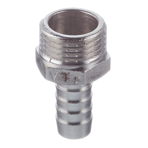 Фитинг выполнен из латуни, защищенной никелевым гальванопокрытием. Присоединительный патрубок снабжен цилиндрической трубной наружной резьбой с насечками для лучшего удержания герметика. Штуцер для шланга имеет конфигурацию, эффективную для его фиксации. Присоединение шлангов необходимо производить с помощью плоских обжимных хомутов. Длинна – 12 мм, диаметр – 1/2"