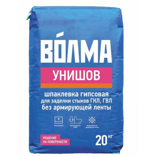 «ВОЛМА Унишов» (ГОСТ Р 58278-2018) — многофункциональная сухая шпаклевочная смесь на основе натурального гипсового вяжущего, модифицированная минеральными и химическими добавками, обеспечивающими высокую адгезию, водоудерживающую способность и оптимальное время работы.