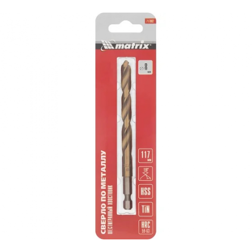 Сверло по металлу, 8 мм, HSS, нитридтитановое покрытие, шестигранный хвостовик Matrix Артикул: 717802
