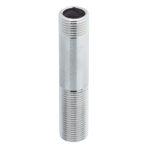Резьба двухсторонняя наружная трубная цилиндрическая по ГОСТу 6357 (ISO 228, EN 10226). Длина 100 мм, диаметр – 1/2". Материал – никилерованная латунь.