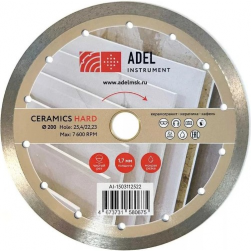 Отрезной алмазный диск Adel Instrument Hard Ceramics 200мм - предназначен для мокрой резки изделий из керамогранита, керамической плитки, мрамора.