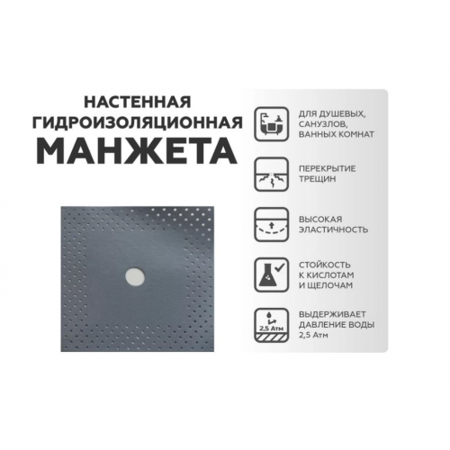 Настенная манжета представляет собой квадрат из водонепроницаемого, стойкого к старению эластомера, нанесенного на полиэфирное полотно. Краевая перфорация обеспечивает отличную фиксацию манжеты в гидроизоляционном материале. Применяется для эластичной гидроизоляции мест выхода труб из стены во влажных помещениях (душевых, санузлах, ванных комнатах и т.д.).