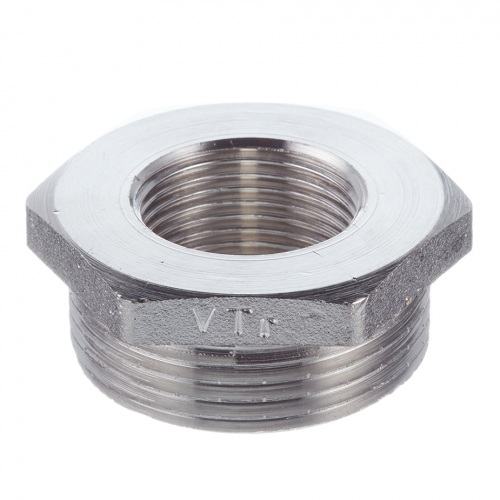 Изделие выполнено из латуни марки CW617N, никелировано. Резьба – наружная/внутренняя, по типу – трубная цилиндрическая, совместимая с наружной конической (ГОСТ 6211). Шестигранная головка футорки служит ее вкручиванию гаечным ключом. Размер 1 1/4"х3/4"