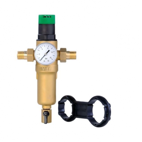 Фильтр промывной прост в обслуживании, продлевает срок службы сантехнического оборудования.В фильтр встроен дренажный шаровой кран со штуцером для подключения шланга и манометр для контроля уровня загрязненности сеток. Фильтр монтируется в вертикальном положении, колбой вниз.Фильтр совмещен с регулятором давления.Материал корпуса, латунь. Максимальная рабочая температура, 80°С. Максимальное рабочее давление, 25 bar. Степень фильтрации, 100 мкр.Фильтр со встроенным редуктором давления для предварительной очистки воды от механических примесей - частиц ржавчины, волокон пеньки, песчинок, защиты сантехники, бытовой техники подключенной к водопроводу. Фильтр представляет собой комбинацию промывного фильтра с клапаном понижения давления. Встроенный в корпус клапан понижения давления позволяет защитить магистрали и устройства водопотребления от нежелательных колебаний давления, а также уменьшить расход воды.На корпусе предусмотрен манометр, позволяющего визуально отслеживать давление воды на выходе. Регулирующая пружина клапана с водой не контактирует. Седло клапана сбалансировано. Встроенный клапан понижения давления работает по принципу выравнивания давления. Давление мембраны уравновешено давлением регулирующей пружины. Это означает, что выходное давление возрастает до тех пор, пока усилия мембраны и действующей в противовес регулирующей пружины не будут уравновешены. Величина давления на входе не влияет на открывание или закрывание клапана, вследствие чего изменение входного давления не оказывает влияния на давление выходное. В обычном режиме вода проходит через фильтрующий элемент по направлению к выпускному отверстию корпуса. Для осуществления промывки необходимо открыть шаровой клапан, выпускающий скопившиеся на дне чаши фильтра примеси; подача воды при этом не прерывается.