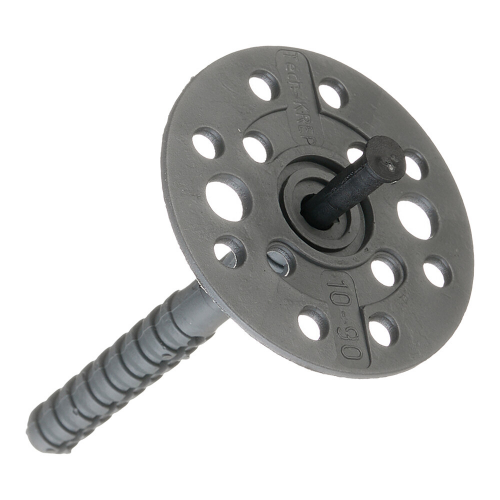 Предназначен для крепления легких теплоизоляционных изделий к внутренним и наружным поверхностям зданий различного назначения, в том числе в системах вентилируемых фасадов, штукатурных фасадов и колодезной кладке, в такие основания, как тяжелый и легкий бетон, полнотелый керамический и силикатный кирпич, керамзитобетонный блок. За счет широкой шляпки дюбель часто называют "парашют" или тарельчатый дюбель. Конструкция широкой шляпки дюбеля плотно прижимает теплоизоляцию, отверстия позволяют утопить дюбель в клее без потери эластичности шляпки. В комплекте с дюбелем поставляется пластмассовый гвоздь, который для большей прочности армирован стекловолокном. Цвет изделия не влияет на технические характеристики.