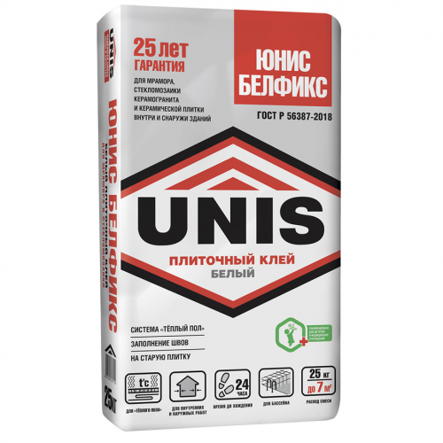 Клей на основе белого цемента. Для укладки керамической, керамогранитной, мозаичной и стеклянной плитки, стеклоблоков, плит из природного камня на пол и стены в любых помещениях: влажных, сухих, промерзающих и отапливаемых. Для наружных работ, облицовки зданий. «ЮНИС БЕЛФИКС» рекомендуется для сложных задач: укладки поверх старой плитки, применения в системе «Тёплый пол», облицовки резервуаров для воды (бассейны). Может применяться в качестве затирки для плиточных швов или для создания художественно-декоративных эффектов (панно, рельефы и т.п.). Для внутренних и наружных работ.
