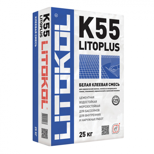 Сухая клеевая смесь на основе белого цемента для укладки стеклянной мозаики, плитки из керамики и натурального камня при внутренних и наружных работах, в том числе в бассейнах и помещениях с повышенной влажностью. Клей LITOPLUS K55 обладает повышенной тиксотропностью, поэтому при облицовке вертикальных поверхностей сползание плитки или мозаики отсутствует. Водо-, морозостойкий. Экологически безопасен, не содержит волокон асбеста. Подходит для облицовки форматом до 120х90 см. Классификация по EN 12004/12002 и по ГОСТ Р 56387 – C2TЕ.